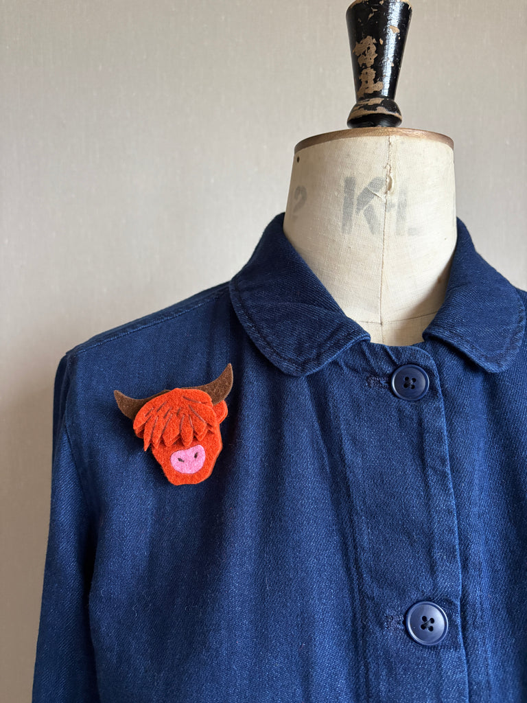 This is a hairy little Highland Coo for your lapel, jumper, jacket or bag.