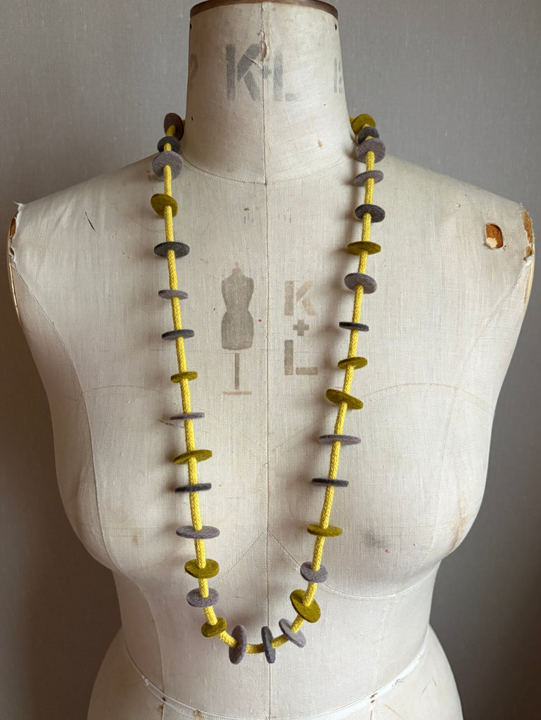 Soft shades of mustard & grey wool industrial felt discs are added to the soft cotton rope to make a striking but versatile necklace.