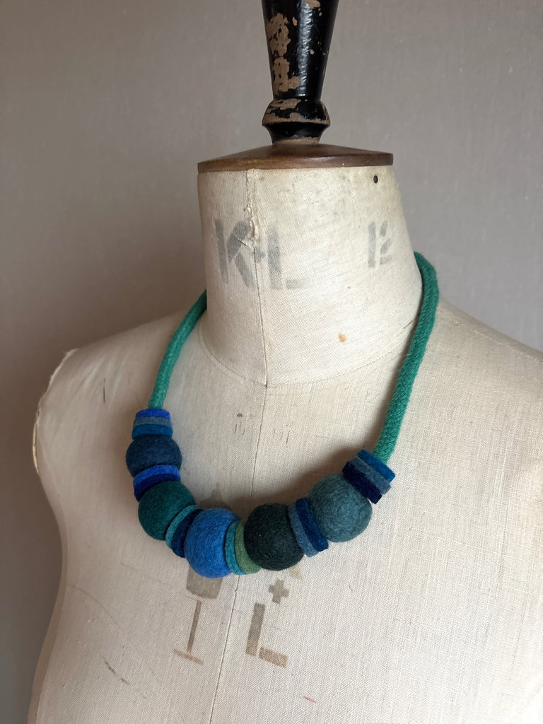 This necklace is fast becoming one of my best sellers, it's a little more petite than some of my chunkier styles. Handmade merino felt beads contrast with industrial felt discs to make a striking but also easy to wear necklace.