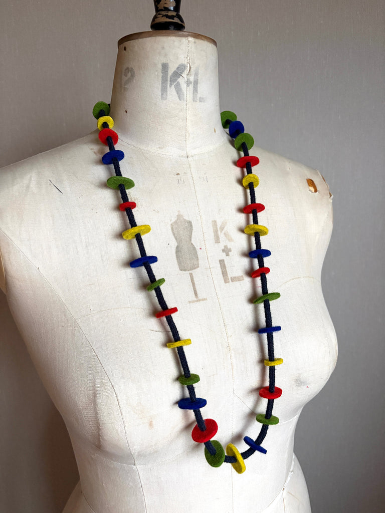 Primary colours, inspired by Bauhaus, wool industrial felt discs are added to the soft cotton rope to make a striking but versatile necklace.